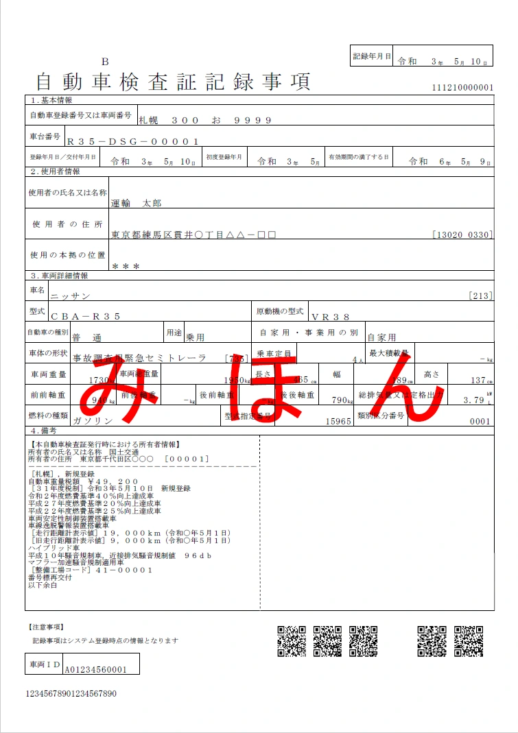 【自動車検査証記録事項見本 A4サイズ相当】